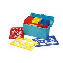 A selection of the most popular stencil designs with over 200 images of animals, flowers, letters, people, dinosaurs, holidays, and more. Each stencil is made of durable plastic in fun translucent colors. Comes in a plastic storage box with handle. Set of 24.