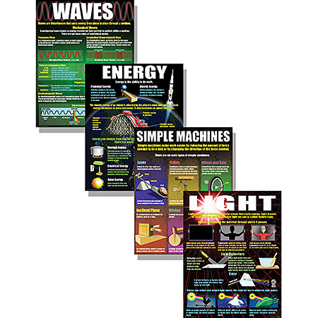 Students learn about types and properties of waves, the design and effectiveness of simple machines, the characteristics and behaviors of light, and the usefulness of various forms of energy. Package includes 4 posters, 4 reproducible activity sheets, and a helpful teacher's guide.
