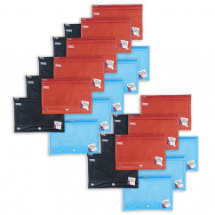 Pocket pencil pouch, has a mesh front for easy viewing. Fits easily into a 3 ring binder and has reinforced grommet holes. Durable construction for long lasting use. Set of 24 in assorted colors: black, blue and red.