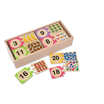 Match these wooden puzzle pairs to make mastering numbers as easy as 1, 2, 3. Groups of objects illustrate numbers 1-20, and the puzzles are self-correcting--each piece has only one match that fits--so children can play independently and learn all the while. Dimensions: 5.75" x 13.75" x 3" Assembled |