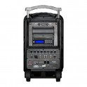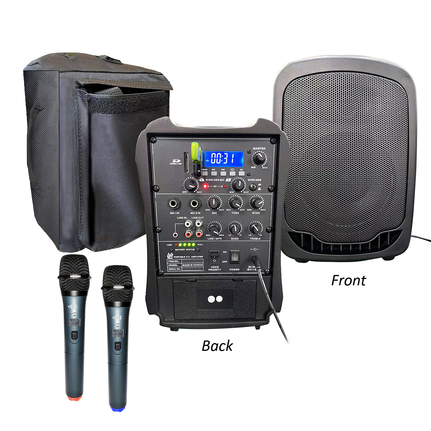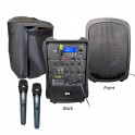 Specifications • Power output: 30W RMS / 60W Max. • Speakers: 6.5” Woofer Speaker, 1” Tweeter • Power Supply: AC (15V 2A Adapter) DC/Battery: 11.8V 4.4Ah Rechargeable Lithium • THD (Total Harmonic Distortion): 1% @10W RMS • Frequency response: 50Hz-18KHz ±3dB • Input: ¼” Wireless/wired mic-in (2), 3.5mm Aux-in (1), RCA Line-in (1-L/R) • Output: RCA Line-out (1-L/R) • USB & SD card capacity: Up to 32GB • Charging time: 7-9 hours • Operation time: 4-6 hours (depending on volume level)
