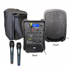 The VENU100M is a compact, portable, powerful, versatile and mini PA amplifier system with all the latest features, including an ABS-engineered plastic shell, making it highly durable and impact-resistant. Its compact size allows it to be easily transported and positionable in most environments. This unit comes with two handheld wireless microphones, making this a superior, complete and powerful PA system. Delivering a powerful amplifier with built-in rechargeable batteries, Bluetooth receiver and USB port/SD card slot, it is ideal for any setting requiring excellent, reliable and portable sound quality. Built with the latest technologies to minimize and eliminate interference and feedback delivering stable frequency VENU100M delivers crisp, clear sound, with the included dual microphones for maximum versatility. pecifications • Power output: 30W RMS / 60W Max. • Speakers: 6.5” Woofer Speaker, 1” Tweeter • Power Supply: AC (15V 2A Adapter) DC/Battery: 11.8V 4.4Ah Rechargeable Lithium • THD (Total Harmonic Distortion): 1% @10W RMS • Frequency response: 50Hz-18KHz 3dB • Input: ” Wireless/wired mic-in (2), 3.5mm Aux-in (1), RCA Line-in (1-L/R) • Output: RCA Line-out (1-L/R) • USB & SD card capacity: Up to 32GB • Charging time: 7-9 hours • Operation time: 4-6 hours (depending on volume level)
